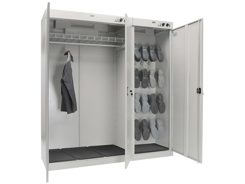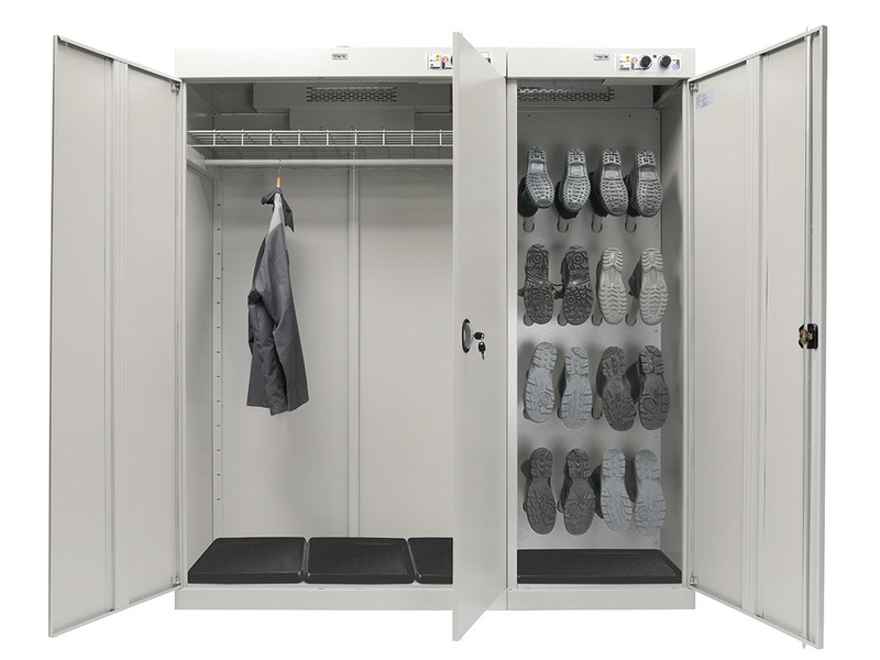 - шкаф состоит из двух независимых секций. Первая двухдверная для одежды, с перекладиной для вешалок и полкой. Вторая - для сушки обуви, оборудована патрубками для её развешивания